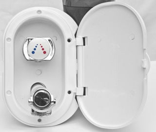 Box doccia con rubinetto miscelatore acqua calda/fredda + doccia a pulsante estraibile. Dim.: vano est. mm 185x124 incasso mm 150x180x40. Adatto per montaggio sia verticale che orizzontale. Con tubo da mt 4.