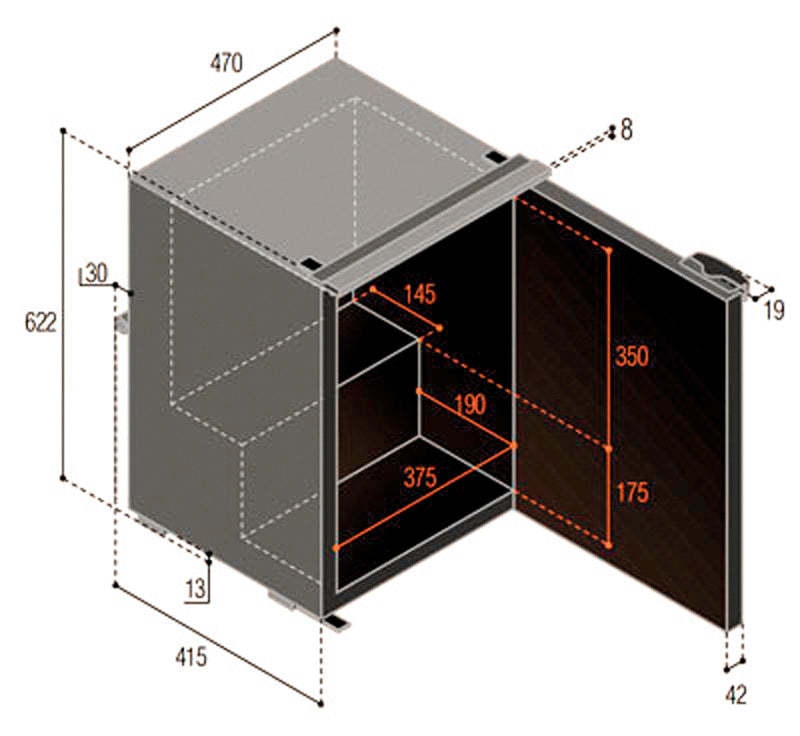 C60I. Capacità lt 60 - peso netto kg 15,8 - tensione alimentazione 12/24 volts. Assorbimento nominale 36,29 watt potenza assorbimento kw 0,32 – 24h.