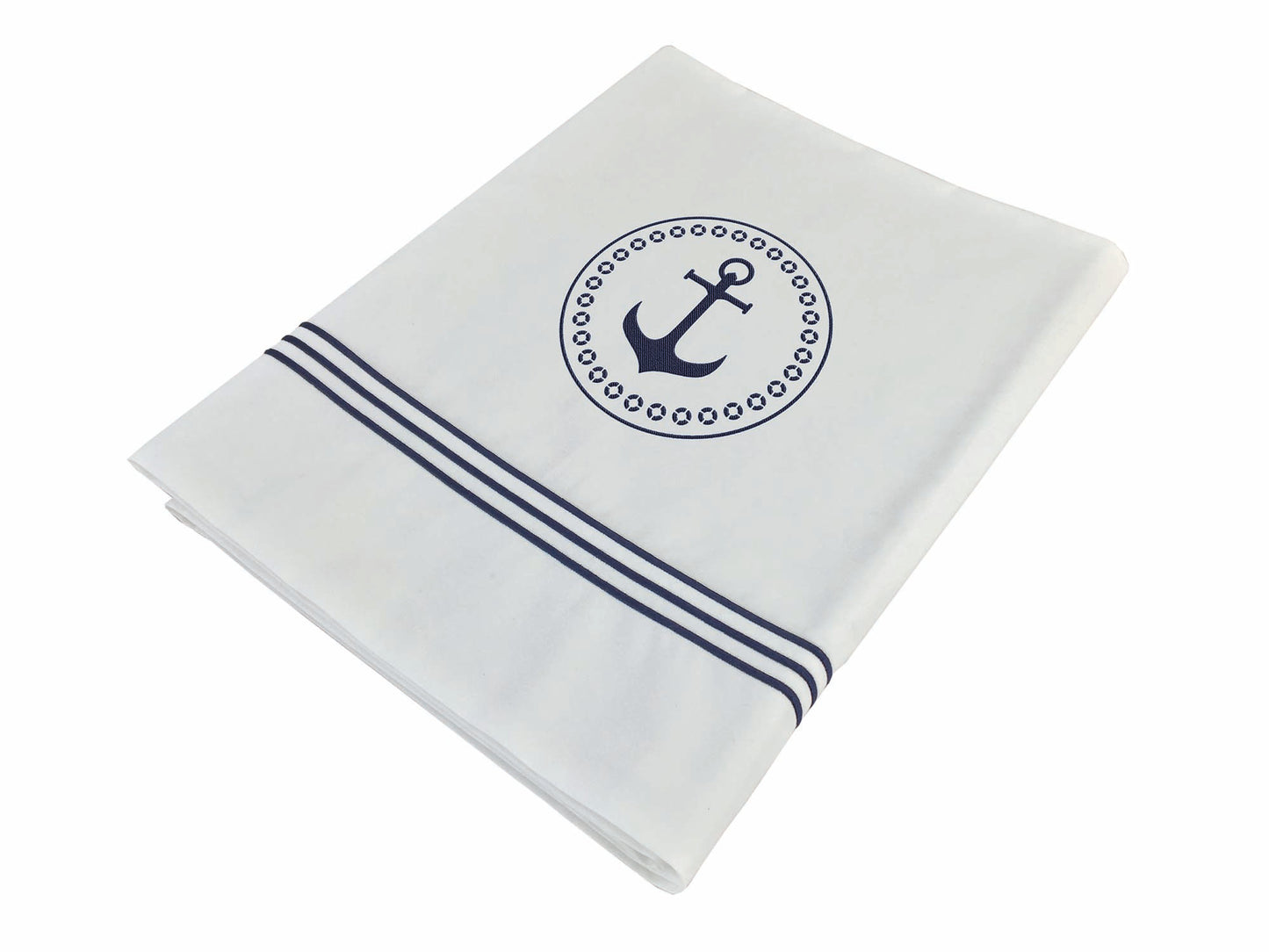 Set lenzuolo SINGOLO + federa cuscino in puro cotone, colore BIANCO con decori BLU NAVY. Dim. 280x130 cm - 90x45 cm.