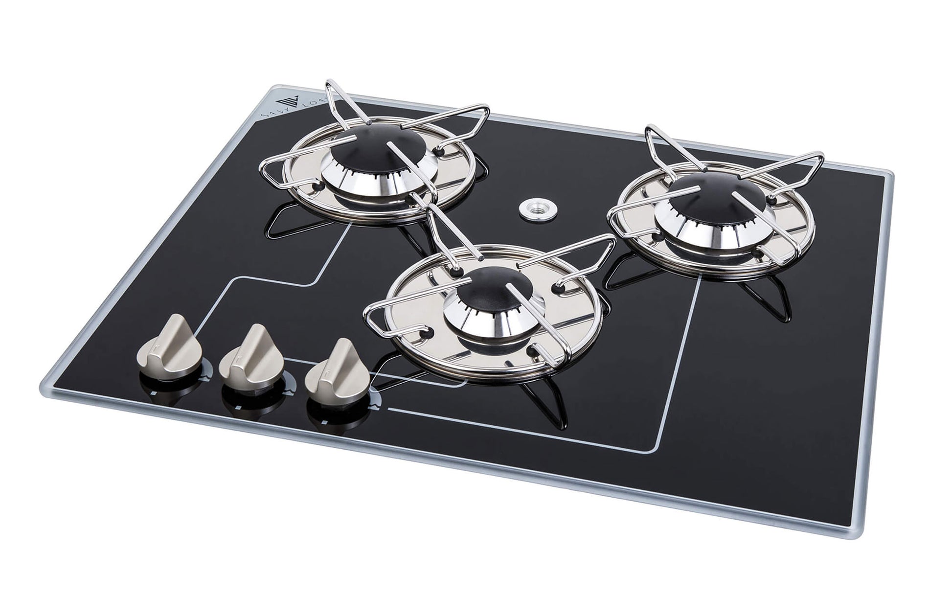 Piano cottura ad incasso in vetro temprato nero, spessore 8 mm con 3 bruciatori(2 semi rapido, 1 ausiliario). Accensione manuale con dispositivo di sicurezza termocoppia. Dimensioni 410x504 mm, dimensioni incasso 390x484 mm, peso 5 kg.