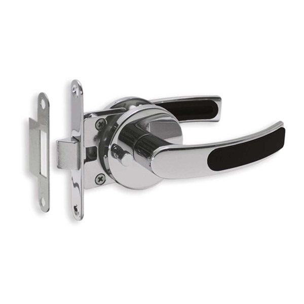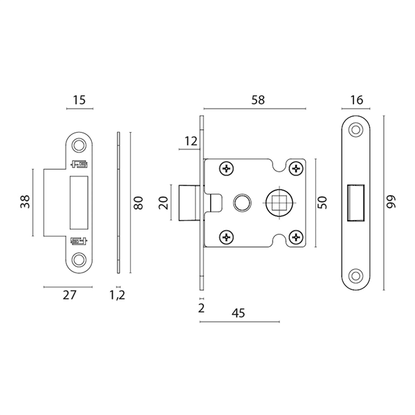 Serratura universale in ottone con piastre in acciaio inox AISI 316 L completa di maniglia. Dimensioni contenute, possibilità di posizionare lo scontro, per mezzo di una vite, prima di incassare la serratura nella porta per ottenere la chiusura destra o sinistra. Dimensioni 130 x 44 mm, Scatola 58 x 50 x 14 mm, Mostrina 99 x 16 x 2 mm, Quadro maniglia 8 mm, Entrata 45 mm, Range spessore porta da 20-40 mm.
