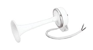 Tromba elettromagnetica MARCO TCE di dimensioni ridotte (lungh. totale cm 25) ma di notevole potenza. Corpo e cornetto in ottone verniciato bianco. 12 volt - 5 Amp