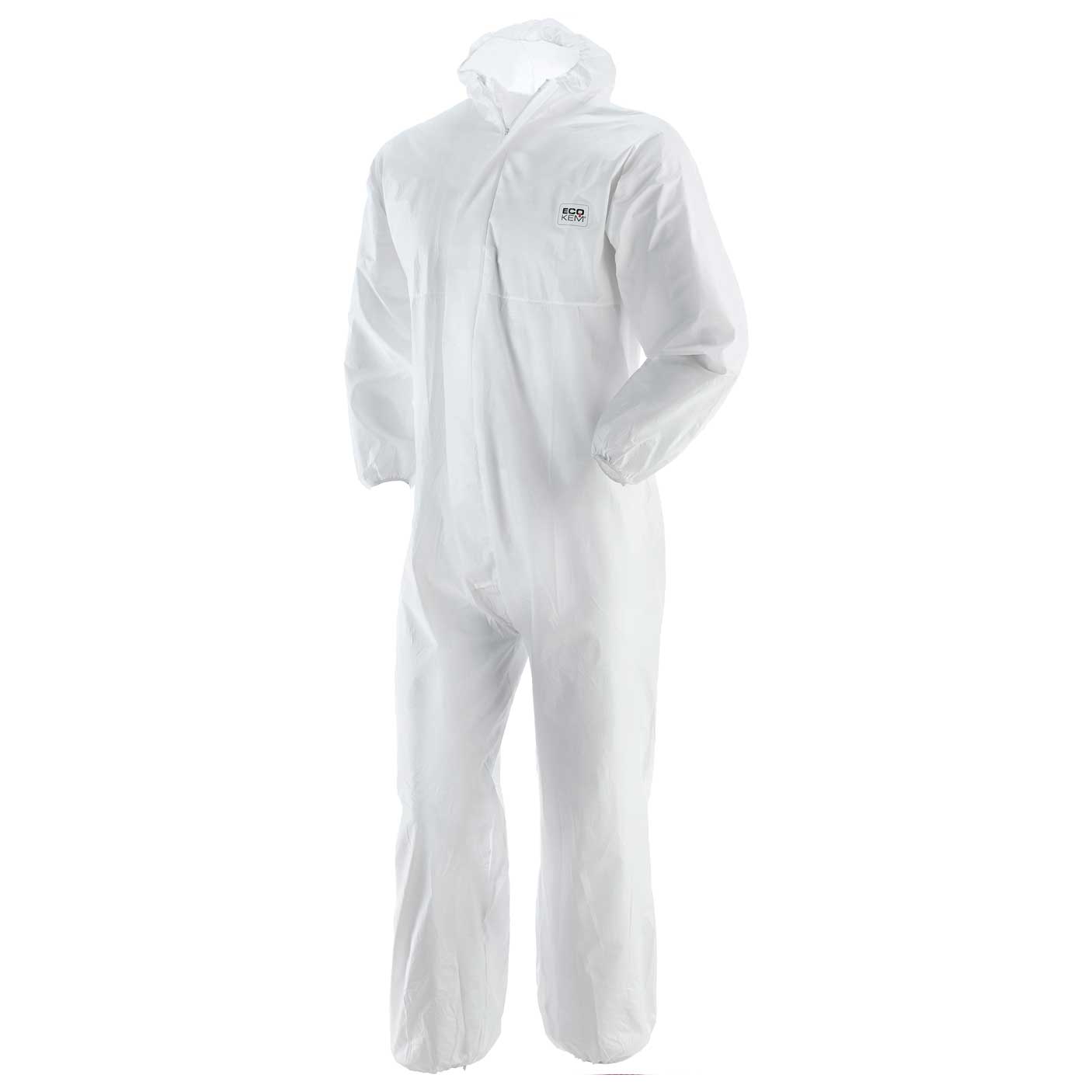 Tuta intera monouso con cappuccio in tessuto-non tessuto in polipropilene ricoperto da un film microporoso di polietilene. Materiale ipoallergenico, Peso tessuto 63 g/m2, cappuccio fisso con elastico senza lattice. Elastico stringipolso, stringicaviglia, stringivita senza lattice. Chiusura con cerniera e patta di 5 cm. Colore: bianco, taglia XXL