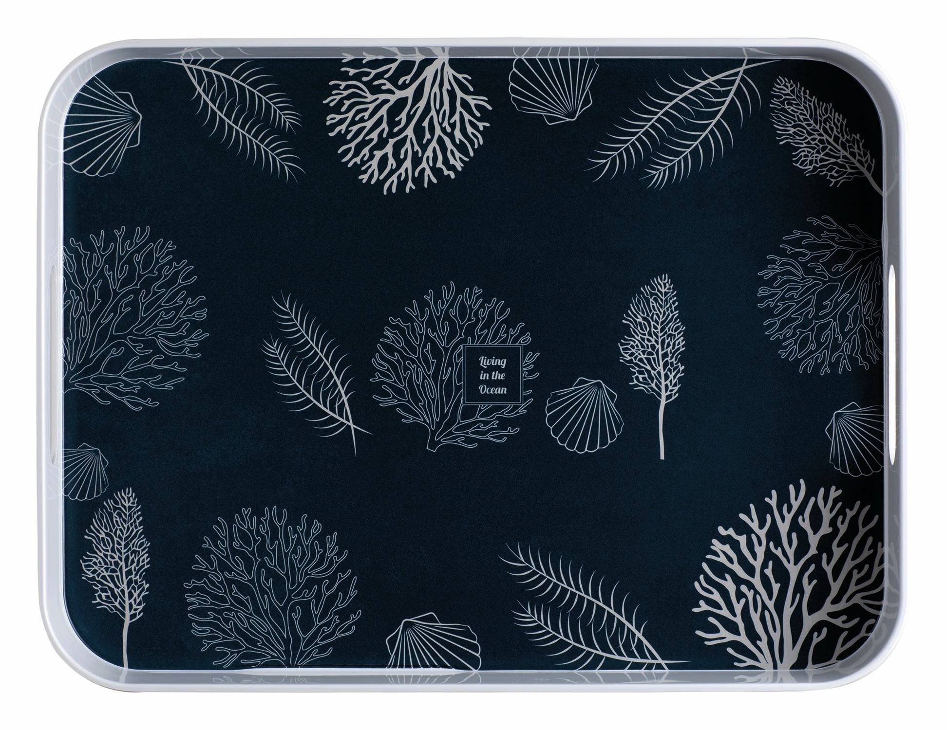 La nuova collezione LIVING è caratterizzata da un leggero disegno di coralli in blu navy e beige, elegante e contemporaneo, perfetto per tutte le occasioni. Le stoviglie, realizzate al 100% in melammina, ed i bicchieri, realizzati in Tritan BPA Free, sono molto resistenti e lavabili in lavastoviglie e presentano una base antiscivolo che ne impedisce lo scivolamento sul tavolo. Il vassoio ha anche due generosi fori per afferrarlo e ha alti bordi anticaduta che impediscono di far cadere i bicchieri o le tazze durante il trasporto. Ha anche dei fermi antiscivolo sulla base per una maggiore sicurezza. Dim. 40x30 cm.